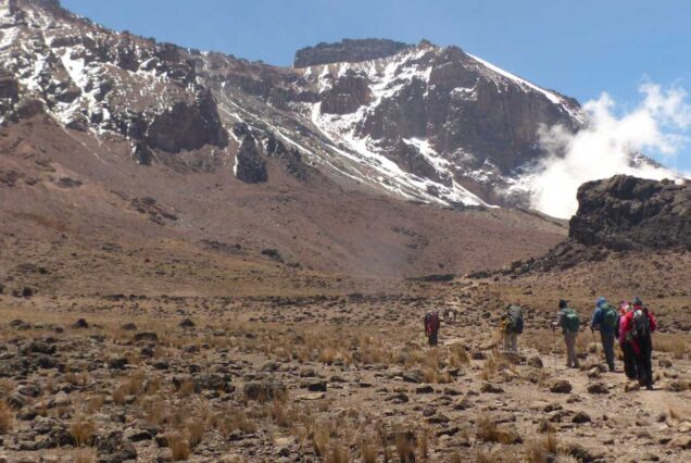 Today we climb very gradually towards the lunar desert of the Saddle between Mawenzi and Kibo. These 6-7 hours walking will be taken at a slow pace until we reach Kibo Hut (4,700m), where we will spend the night in a comfortable hut. There is no running water at Kibo Hut. The remainder of the day is spent relaxing in preparation for the final ascent before a very early night. Horrombo Hut to Kibo Hut (4,700 m.); 4-6 hours walking.